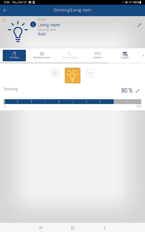 Über die intuitive Oberfläche lässt sich auswählen, ob „Dimmen“ oder die „Treppenlicht-Funktion“ konfiguriert werden soll. Im Modus „Dimmen“ können die minimale/maximale Helligkeit, die Einschalthelligkeit und das Dimmverhalten mit wenigen Klicks programmiert werden. Im Modus „Treppenlicht“ sind die Treppenlichtzeit, die Helligkeit bei Ausschaltvorwarnung sowie die Einschaltzeit einstellbar.