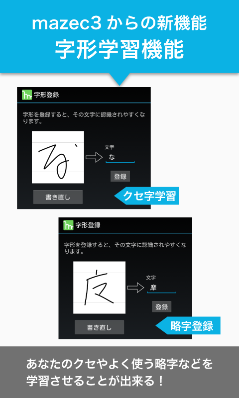 Ausgestattet mit "Handschrift-Lernfunktion (automatisches Lernen von handschriftlichen Zeichen)" / "Registrieren von Glyphen (Registrieren von handschriftlichen Zeichen)", um die Zeichenerkennung entsprechend der Zeichenform des Benutzers abzustimmen.
