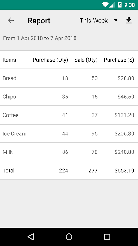• Säubern Sie den Transaktionsbericht für Balken über Verkäufe und Einkäufe (nach Woche / Monat / benutzerdefiniertem Bereich)