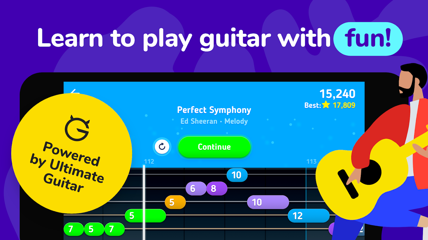 Verbessere deine Fähigkeiten, indem du beliebte Songs spielst. Die App hört Sie spielen und gibt Ihnen Feedback, so dass Sie schneller Ergebnisse erzielen und Songs spielen können, die Sie lieben.