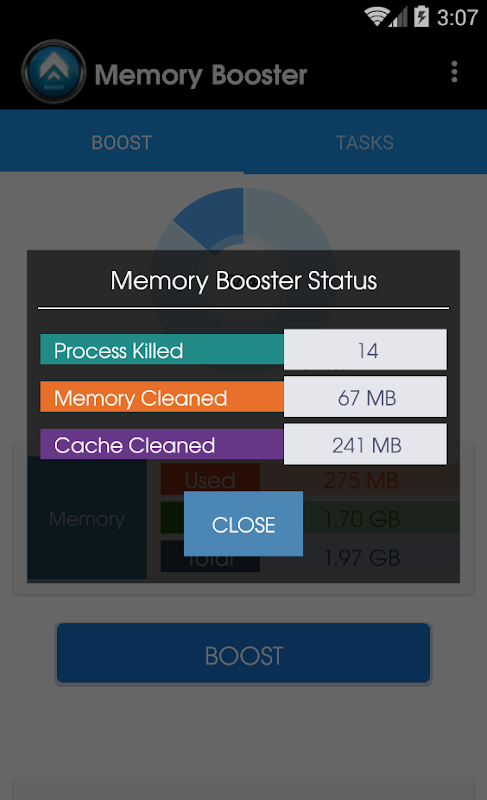 You can boost your RAM with single touch. Touch boost button and clear running process. In Tasks tab you can swipe to clean individual process from ram memory.