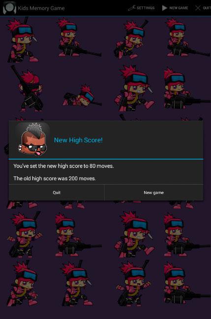 The game has 4 modes Soldier. Each mode comes with 12 pairs or 24 cards in all. Tap the card to see the item behind it. If you get one pair right, the cards will face forward. If there is a mismatch, both cards will flip backward again.