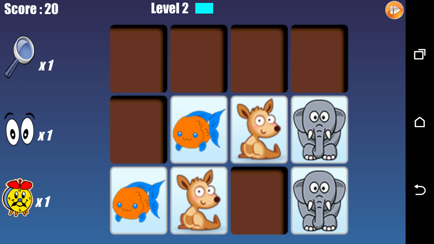 * Memory Games contains very cute images of animals as lion, cat, dog, elephant, etc., which are on memory cards.
