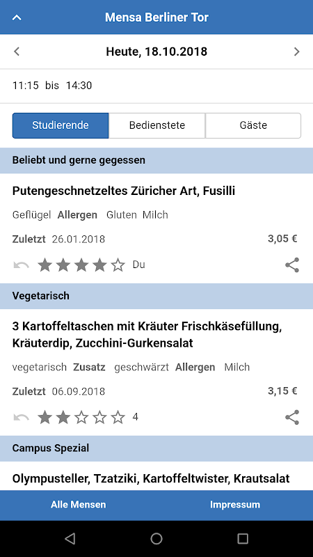 Die intelligente Favoriten-Funktion merkt sich die am häufigsten aufgerufenen Mensen. Eine nicht mehr besuchte Mensa verschwindet nach einiger Zeit von selbst aus den Favoriten.