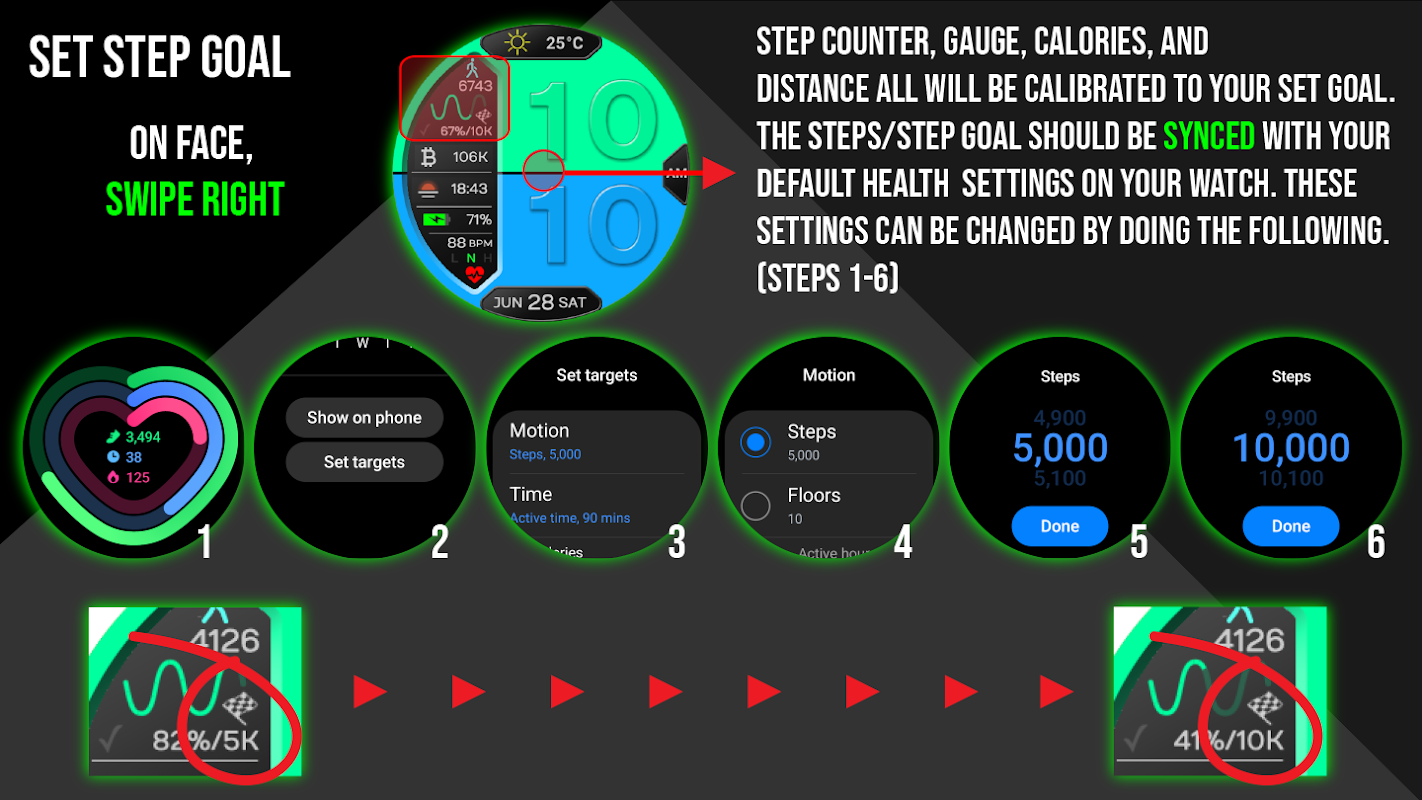 * Zeigt den täglichen Schrittzähler und das Schrittziel in Prozent mit einer benutzerdefinierten Grafik an. Das Schrittziel wird über die Samsung Health App oder die Standard-Health-App mit Ihrem Gerät synchronisiert. Die Grafikanzeige stoppt bei Ihrem synchronisierten Schrittziel, der numerische Schrittzähler zählt jedoch weiterhin bis zu 50.000 Schritte. Um Ihr Schrittziel festzulegen/zu ändern, beachten Sie bitte die Anweisungen (Bild) in der Beschreibung. Neben der Schrittzahl werden auch der Kalorienverbrauch und die zurückgelegte Strecke in Kilometern oder Meilen angezeigt. Ein Häkchen (✓) neben dem Schrittsymbol zeigt an, dass das Schrittziel erreicht wurde. (Weitere Informationen finden Sie in der Anleitung im Haupt-Store-Eintrag.) Tippen Sie auf das Schrittsymbol, um die Health-App zu öffnen.