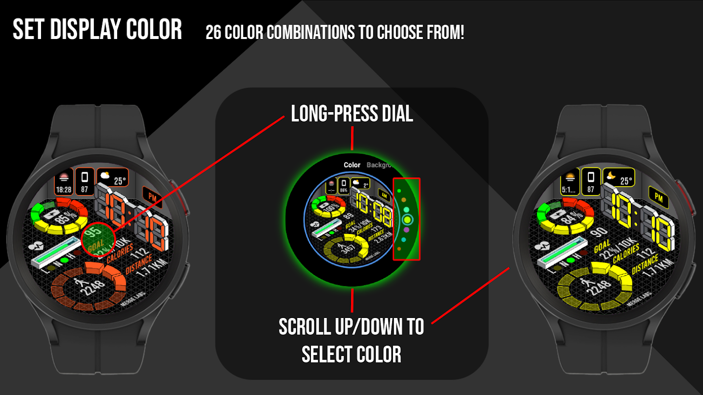 - Hunderte mögliche Farbkombinationen für die Digitalanzeige und 8 verschiedene Hintergrundfarben.