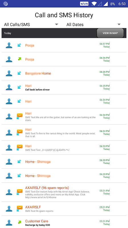 - Klicken Sie in der Anwendung auf die Schaltflächen „Ansicht“, um die Aufzeichnungen der letzten Anrufe oder Nachrichten in der Listenansicht anzuzeigen.