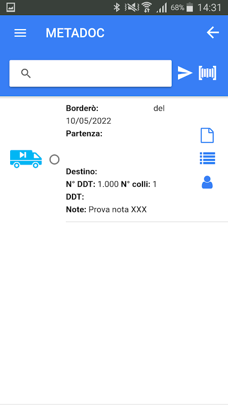 Die MetaDoc APP ist mit TESISQUARE PLATFORM TMS verbunden und ermöglicht für den Transport von Rohstoffen: die Übernahme, die Verwaltung von Reiseveranstaltungen und die Verwaltung der Lieferung (POD). Der erste Schritt erfolgt durch die Übernahme der Grenzeò durch den Fahrer, der dies durch Eintippen der Grenznummerò oder durch automatisches Lesen des Strichcodes vornehmen kann. Anschließend bringt er die Annahmeunterschrift an und der Ausdruck des PIC wird generiert und an das TMS gesendet. Gleichzeitig werden die E-Mails an den Spediteur und an den Empfänger gesendet, die als Anhang das pdf von Bordüreò (Einzel-PDF mit DDT), Packliste und PIC enthalten. Während der Fahrt über die Funktion REISEEREIGNISSE hat der Fahrer die Möglichkeit, bestimmte Ereignisse im Zusammenhang mit der einzigen Grenze (z. B. Verkehr, Fahrzeugprobleme usw.) einzugeben und Notizen und Fotos anzuhängen. Das Ereignis wird zum Zeitpunkt der Eingabe in der APP an das TMS gesendet. Schließlich können Sie über das LIEFERMANAGEMENT ein Lieferergebnis zum Zeitpunkt des Transports eingeben. Durch Auswahl der Einzelgrenze bewertet der Fahrer die Lieferung (OK, KO oder Geliefert mit Vorbehalt) und die Unterschriften des Frachtführers und des Empfängers werden angebracht. Beim Speichern wird der POD an das TMS gesendet und E-Mails werden an den Spediteur und an den Empfänger gesendet, die das Borderò-PDF (einzelnes PDF mit DDT), PIC und POD angehängt enthalten.