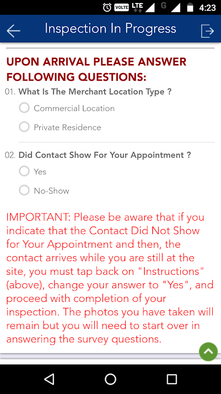 2) Mobile Site Inspection: Dies ist der primäre Fokus der Metro App. Es ermöglicht den Inspektor auf "Inspektion beginnen" und dann den etablierten Prozess durchlaufen auf das, was vom Kunden angefordert wurde. Mit anderen Worten, wenn der Prüfer die Prüfung beginnt, gibt es sie Schritt-für-Schritt-Anweisungen zu folgen, fragt die entsprechenden Fragen und fordert den Inspektor die entsprechenden Fotos zu machen. Metro Inspektionen 'Server erfasst die Antworten auf die Fragen und lädt die Fotos in Echtzeit, während die Inspektion stattfindet. Dazu gehören "zurück" "vorwärts" "überspringen" und "Bewertung" Funktionen. Die "Zurück" Funktion soll ein Prüfer zu ermöglichen, auf frühere Anfragen zurück zu gehen, wenn sie erkennen, dass sie eine Frage falsch beantwortet oder neue Informationen erfahren, die eine frühere Antwort später im Prüfprozess ändern können. Der "Vorwärts" ist gemeint, wieder auf zu fangen, wo sie in der Inspektion waren, bevor die "zurück" -Funktion genutzt haben. Die "überspringen" -Funktion ist für Fragen oder Fotos, die müssen später im Prüfprozess zu kommen als dort, wo sie ursprünglich platziert werden. Wenn es Fotos sind, die nicht verfügbar oder Fragen, die nicht beantwortet werden können, gibt es ein N / A Option. Sobald alle erforderlichen Fotos und Fragen eingegeben werden, gibt es eine Überprüfung Seite, um sicherzustellen, der Inspektor mit den Antworten auf die Fragen und die Qualität der zur Verfügung gestellten Fotos glücklich ist. Sobald der Inspektor bereit ist, den Auftrag zu unterbreiten, gibt es eine Funktion, bei der Inspektor das Gerät auf dem Bildschirm mit dem Finger unterzeichnen können und haben auch die Ansprechpartner vor Ort das Gerät mit dem Finger unterzeichnen. Sobald dies alles abgeschlossen ist, werden die Daten in ein editierbares Formular für unsere Qualitätsprüfungsprozess stattfinden kann eingegeben in.