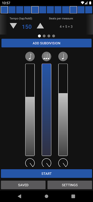 - Wählen Sie eine beliebige Anzahl von Beats pro Takt oder üben Sie gemischte Pegel wie 4 + 3 + 5, wobei die Segmente des Takts automatisch akzentuiert werden