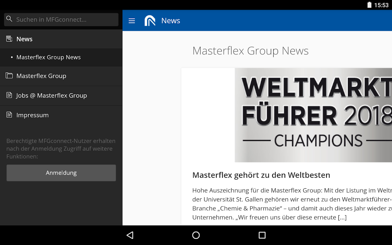 MFGconnect informiert vor allem Mitarbeiter, aber auch Partner und Kunden der Masterflex Group umfassend über das aktuelle Geschehen des Konzerns. Mit Benachrichtigungen sind Sie somit immer und überall auf dem aktuellsten Stand.
