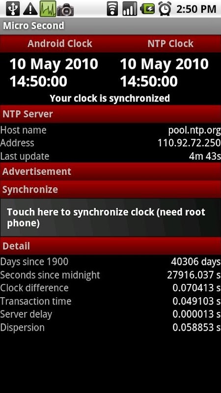 Time is money! Synchronize your android clock to remote NTP server accurately. This application will notify you when clock is skewed. To synchronize you must have rooted phone.