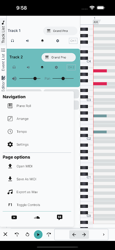 - Pianorolle + ABC-Notation: Schreiben Sie Musik visuell oder durch Eintippen von Noten (A–G). Wählen Sie die Methode, die Ihnen am besten passt – beide aktualisieren die Musik in Echtzeit.