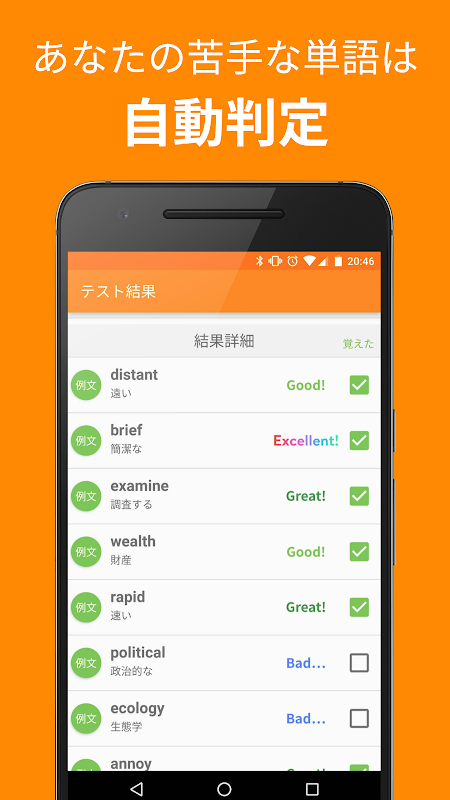 知っていたら右へ、知らなかったら左へカードをめくるだけで、知らない英単語のみが繰り返し表示され、学習できるようになっています。学習中に発音を同時に聞くことができるため、目で見ながら耳でも英単語を覚えていくことができます。学習後すぐに英単語テストを実施することで、定着度を向上させます。約1分で10単語学習することができるため、通勤・通学やちょっとしたすき間時間にも。