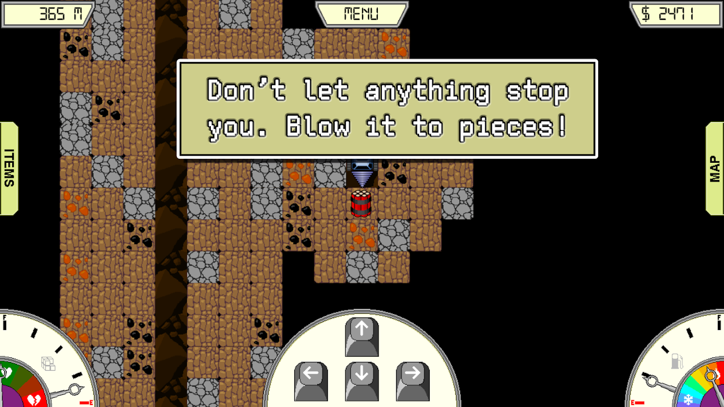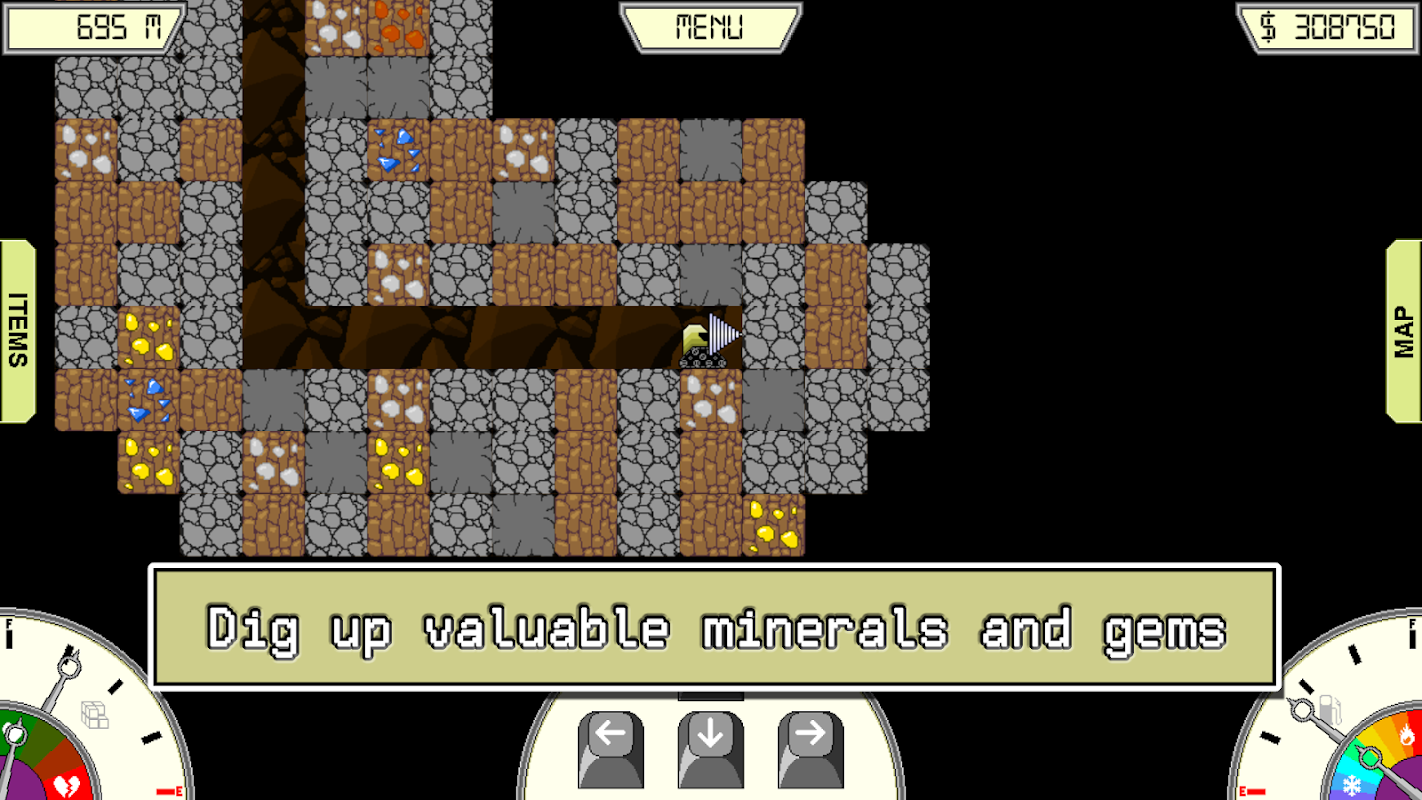 Bereite dich auf ein 8-Bit-Abenteuer unter der Erde vor. Bohre dich durch die Erde und suche nach wertvollen Metallen und Edelsteinen. Kaufe unterwegs Upgrades für dein Fahrzeug, um noch tiefer zu bohren.