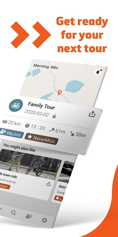Sie können eine Tour mit NeverMiss-Stopps über die MioShare-Website mit Ihrem Computer planen oder unterwegs einen Titel von einer anderen Website herunterladen. Verwenden Sie Komoot-, RouteYou- oder Strava-Routen. Verbinden Sie Ihr beabsichtigtes Konto mit MioShare. Egal auf welche Weise, Sie können Routen drahtlos über WLAN auf Ihren Cyclo herunterladen lassen.