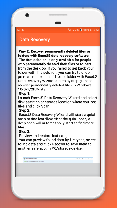Note: This is content-only app that gives you information about how to recover deleted data. If you require any further technical assistance from our expert Data Recovery Team, You can contact us at “[email protected]”.