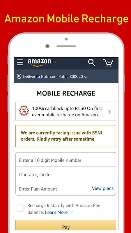 Sie können auch auf Partnerwebsites wie Amazon, Amazon Pay, Mobile Recharge, Mobikwik, My Recharge, Airtel Recharge, My Jio, Oxygen Wallet, Paytm und RechargeIt aufladen, online einkaufen und Rechnungen bezahlen. Laden Sie mit tollen Angeboten und Cashback auf Handyaufladung, DTH-Aufladung, Prepaid-Handyaufladung, Postpaid-Handyaufladungsangebote auf Handyaufladung, Airtel-Aufladung, F-Jio-Aufladung mit Angeboten, Online-Handyaufladung auf.