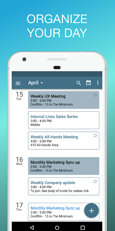 Kalender – Meetings erstellen/bearbeiten, Einladungen annehmen/ablehnen, Verfügbarkeit prüfen und VIP-Kalenderbenachrichtigungen hervorheben und persönliche Kalender importieren.