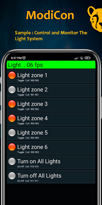 ModiCon can connect Android Devices to Modbus-tcp Equipment as client. Modbus-tcp Equipment like Plc connect to modem-router directly and then app ready to network connection , if router connect to internet app can connect over internet . app have 4368 Programmable tags in 3 Layer (Input,Coil, Register and menu) Layer 1 have 16 tags each contain 16 tag in Layer 2 each contain 16 tags in layer 3.the user can design the human machine interface on Android phone.