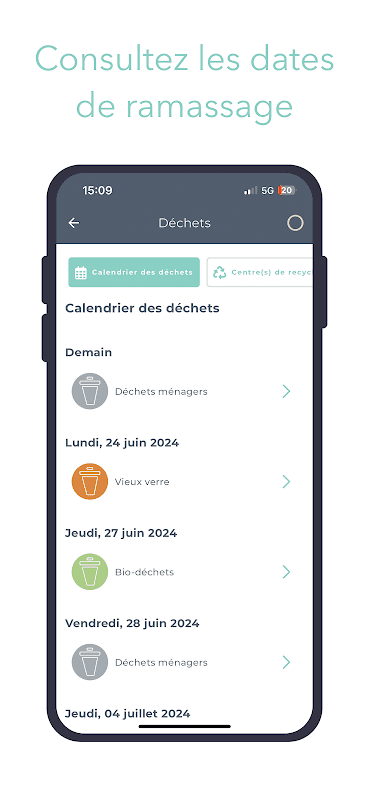 - Greifen Sie auf die Müllabfuhrtermine zu und erhalten Sie eine Benachrichtigung, die Sie daran erinnert, den Müll rauszubringen