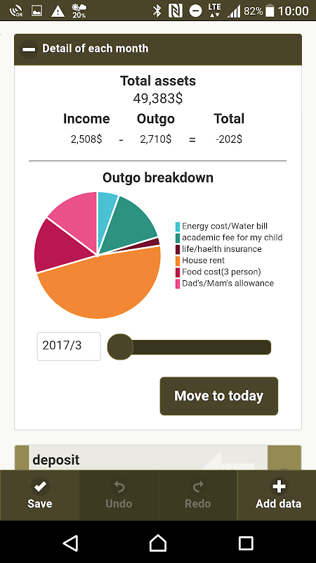 Mit dieser App können Sie Ihr Geld in / out-Plan registrieren Sie sich einfach und prüfen Sie den Übergang von Gesamtmenge an Geld visuell.