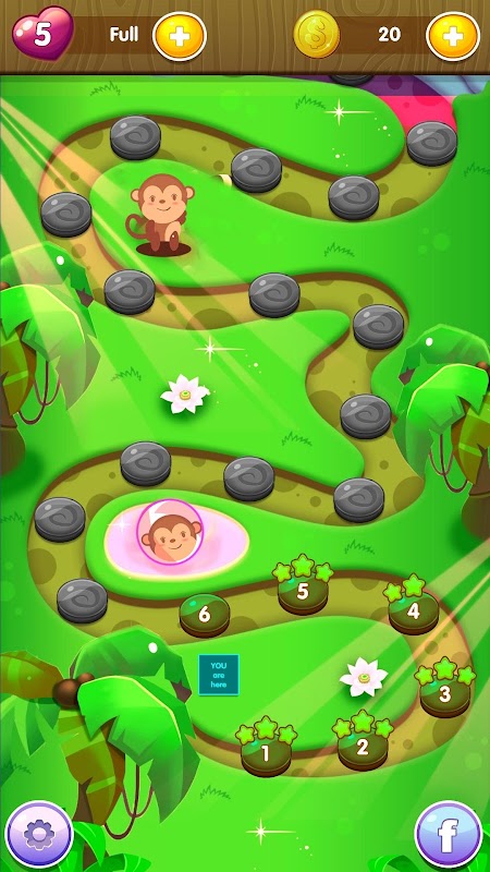Lösche alle Blasen auf dem Bildschirm und rette das Affenbaby, um ein höheres Level zu erreichen, und versuche, in jedem Level 3 Sterne zu bekommen.