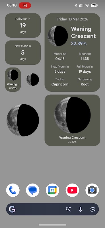 Die App beinhaltet auch einen Belichtungsrechner für die Mondfotografie. Er ermittelt die geschätzte Verschlusszeit basierend auf Ihrer ISO, Blende, den Wetterbedingungen, der Mondposition und der Phase. Mit der Monatsansicht können Sie die Phasen des gesamten Monats überblicken und durch Antippen schnell zu einem bestimmten Tag springen. Zusätzlich bietet die App praktische Widgets für Ihren Startbildschirm, damit Sie die Mondphase immer im Blick haben.