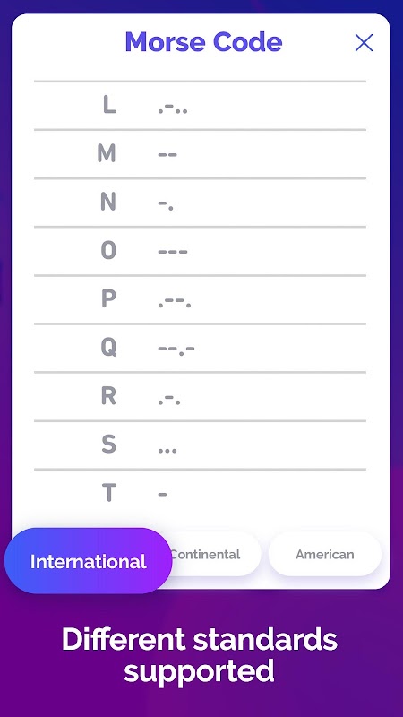 Diese einfach zu bedienende App mit einer intuitiven Benutzeroberfläche wird Ihnen helfen, Morse-Code-Audio in Text und umgekehrt zu übersetzen. Verwenden Sie den CW-Morse-Code bei der Funkübertragung mit diesem handlichen Morse-Code-Schreiber und -Leser. Wandeln Sie Morse-Code in Sekunden in Englisch um, speichern Sie es und teilen Sie die Nachrichten online. Der nützlichste HAM-Radio-Decoder und kostenlose App für Amateurfunk-Praxis ist auf dem Markt! Lernen Sie Morse Code frei, wählen Sie einfach den Code Standard, den Sie verwenden möchten! Kostenloser Download 🔦Morse-Code Übersetzer🔦, so dass Sie Morse-Code heute mühelos lernen und übersetzen können!