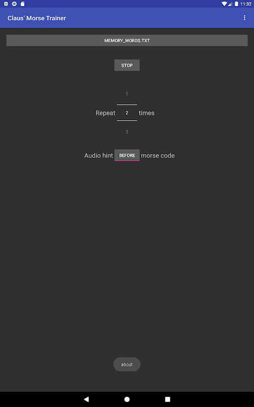 Die App benötigt Schreibzugriff auf den USB-Speicher Ihres Geräts, um zu funktionieren. Für die Wortlisten wird das Verzeichnis "Claus' Morse Trainer" angelegt. Das Verzeichnis kann nach der Deinstallation des Programms sicher gelöscht werden.