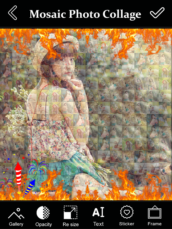 Mosaic Photo Collage App Creator is a great new way to create expressive and unique art using the photos that are already in your smart phone's picture gallery. With the Mosaic Photo application you can digitally create high quality mosaics with any collection of photos. Mosaic Photo Creator, convert your photos into an Art. You can now make a Mosaic Photo just in some few steps. This Mosaic Making app makes high quality mosaic photo collages.