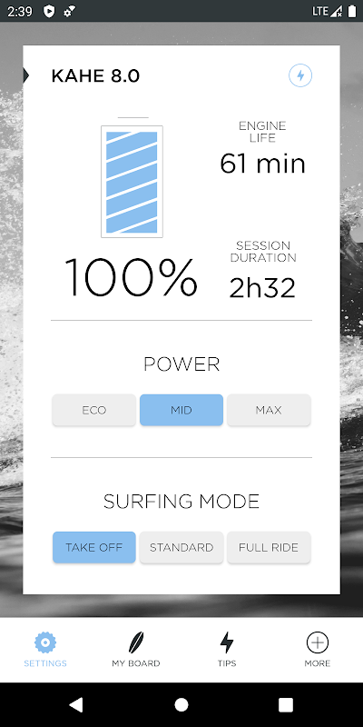 SETTINGS: find practical information on the condition of your battery. Choose the power of the propulsion and select your surfing mode according to your desires or the conditions of the moment.