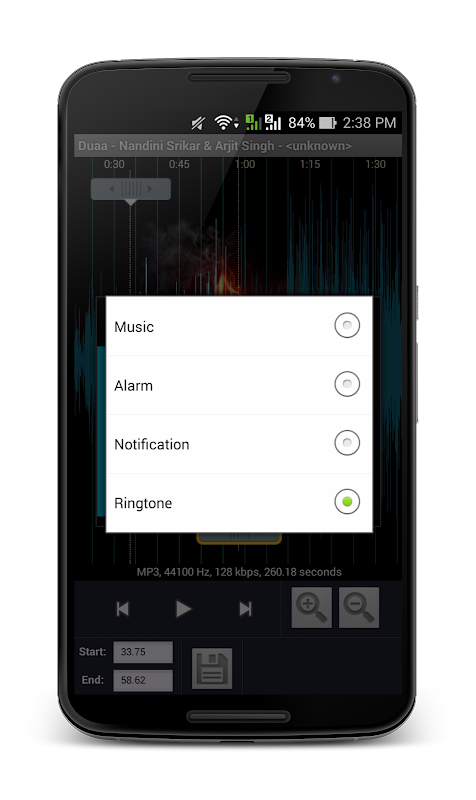 Just select MP3 / music from your device. Select area to be cropped from the audio file and then save as Ringtone / Music / Alarm / Notification.