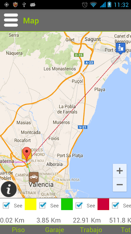 Auf dem Kartenbildschirm finden Sie alle Orte, die Sie eingegeben haben und Ihre aktuelle Position zu visualisieren. Um sie anzuzeigen, wählen Sie sie an der Unterseite des Bildschirms. Sie haben jederzeit, wie viel Abstand es von Ihrem aktuellen Standort zum Ziel finden.