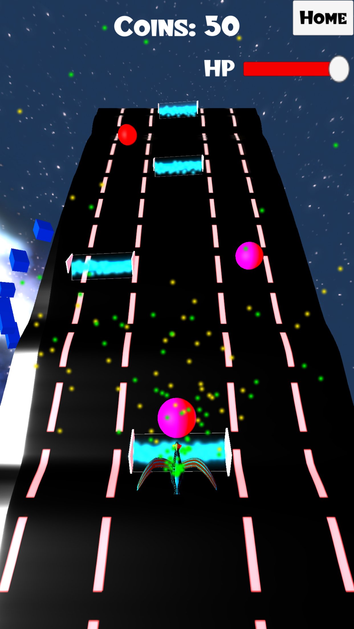 - Dodge the laser beams on the track and collect the colored spheres to regain health.