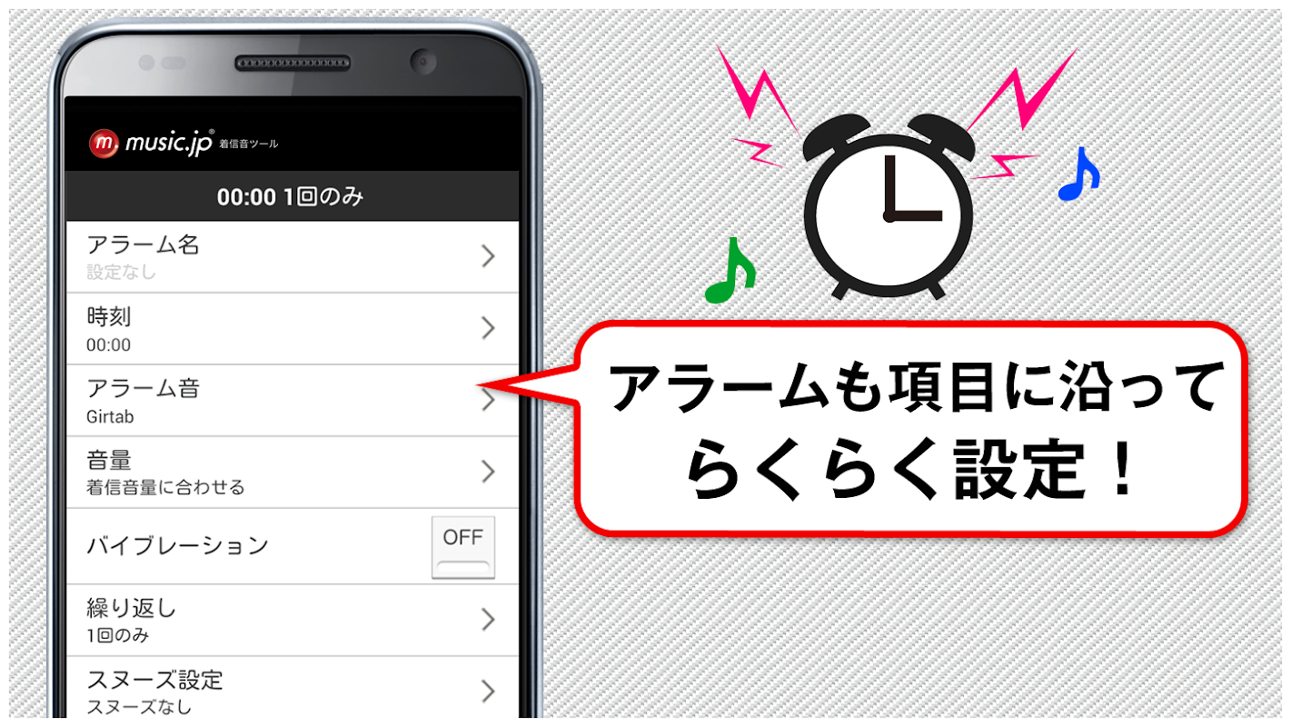 music.jp 着信音ツールはAndroidの電話着信音、アラーム音、メールやアプリの通知音などをまとめてかんたんに着信音設定できる無料アプリです。