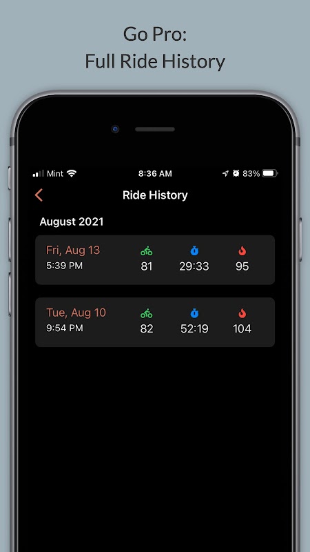 Optional können Sie auf Pro upgraden, um den vollständigen Fahrverlauf mit Diagrammen, benutzerdefinierten Themen und der Option zur Anzeige der durchschnittlichen Trittfrequenz, der verstrichenen Zeit und der Gesamtumdrehungen während Ihrer Fahrt freizuschalten.