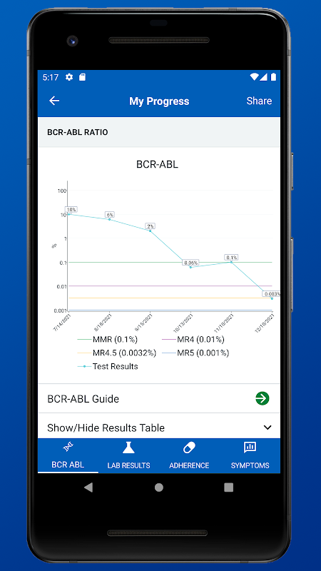 - Die Möglichkeit, wichtige Labortestergebnisse einzugeben. Patienten oder ihre Familienangehörigen/Pflegepersonen können wichtige Bluttestergebnisse wie BCR-ABL-PCR, Blutbild, Nierenfunktion und Leberfunktion aufzeichnen. Die Patienten können dann ihre Ergebnisse im Laufe der Zeit mithilfe der Tabellen und Grafiken im Abschnitt „Mein Fortschritt“ verfolgen.