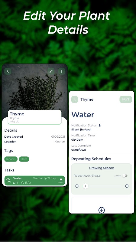 Aplicativo de lembrete de cuidados com as plantas. Rega, alimentação, nebulização e muito mais. Defina seus lembretes de cuidados com a planta aqui. Este rastreador de planta terá eventos agendados para garantir que você não se esqueça de cuidar das plantas da sua casa novamente.