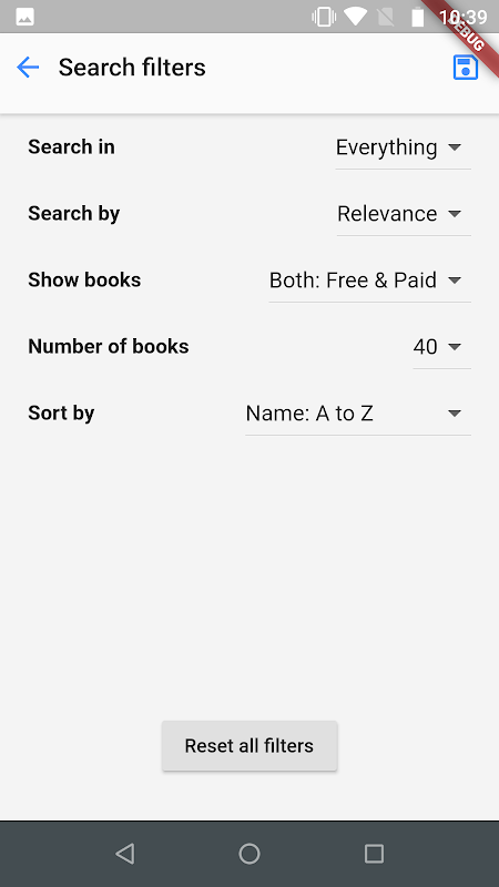 • Reset app option, to reset search filters, user search queries or logout from google account
