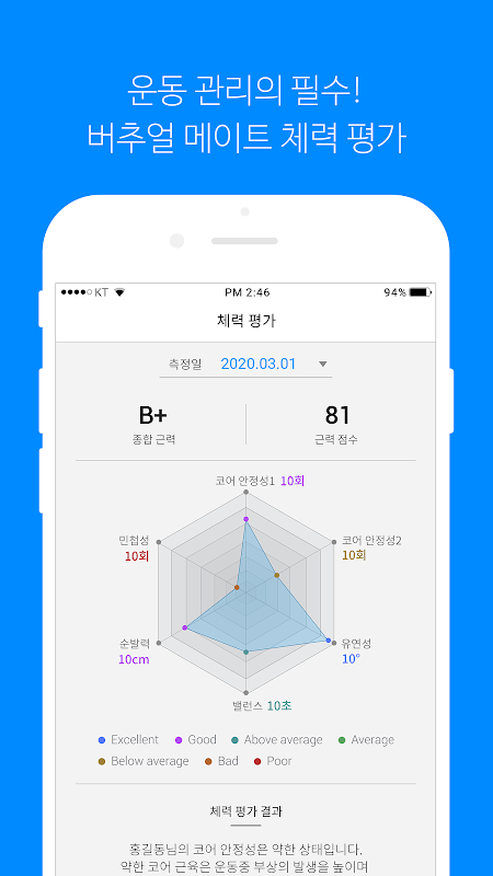 Virtual Mate ist ein neues Konzept-Trainingsgerät, das die Trainingsbewegungen des Benutzers erfassen kann. Wenn Sie das Zentrum verwenden, in dem Virtual Mate installiert ist, können Sie Ihre Körperhaltung und körperliche Fitness messen und ein AI-basiertes Trainingsprogramm genießen. Der Messverlauf kann in der myBenefit-App überprüft werden.