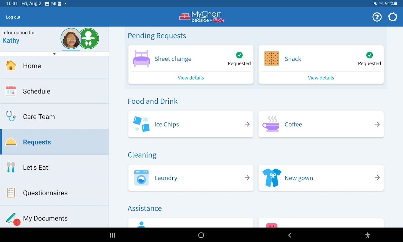 • Bedside für Tablet: Gönnen Sie sich das komplette „Bedside“-Erlebnis auf einem iOS- oder Android-Tablet, einschließlich Funktionen für die Bereitstellung von Dokumentationen und die Kommunikation mit dem Pflegeteam. Für diese Anwendung ist ein vom Krankenhaus bereitgestelltes oder persönliches Tablet erforderlich.