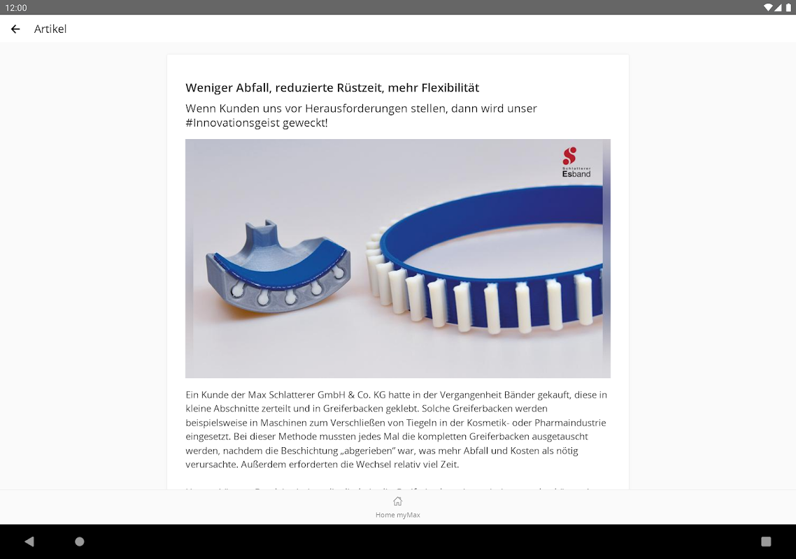 Die App "myMax" bietet allen Interessierten eine mobile Informationsmöglichkeit über das Unternehmen und dessen Nachhaltigkeitsengagement. Entdecken Sie bandtastische Karrieremöglichkeiten bei Schlatterer und erfahren Sie, auf welchen