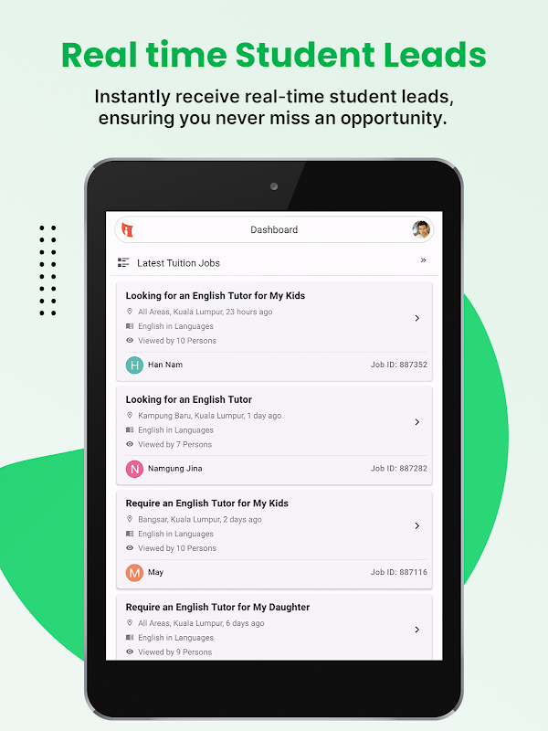 Wir stellen vor: „MyPrivateTutor Malaysia für Pädagogen“ – Stärken Sie Ihre Nachhilfereise mit unserer speziellen App, die speziell auf Pädagogen zugeschnitten ist. Verwalten Sie Ihr Nachhilfegeschäft nahtlos und steigern Sie das Engagement der Schüler mit den folgenden Funktionen: