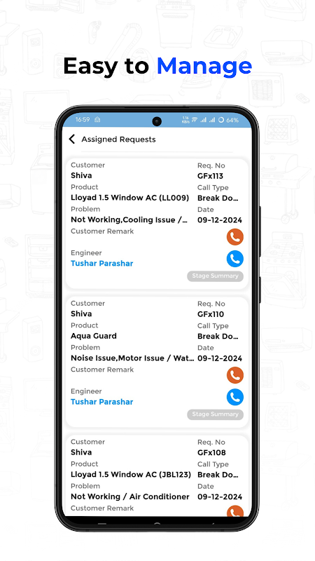 - Beschwerdemanagement – Das Unternehmen kann die Beschwerde registrieren und dem Ingenieur zuweisen. Der weitere Techniker meldet sich in der App an und schließt die ihm zugewiesene Beschwerde.