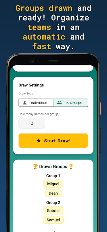 Wählen Sie Namen aus und erstellen Sie ganz einfach Gruppen. Perfekt für Wichteln, Spiele und Teams.