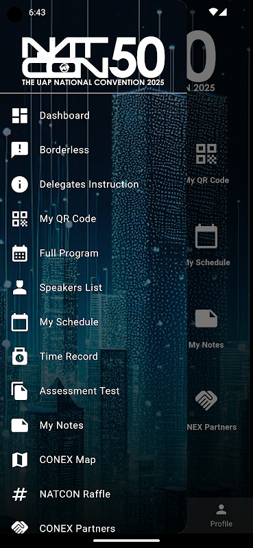 Greifen Sie auf NATCON 50-Dienste zu – sehen Sie sich geplante Veranstaltungen an, QR-Codes zur Verwendung bei der Veranstaltung, Standbesichtigung, Benachrichtigungen zur Veranstaltung.