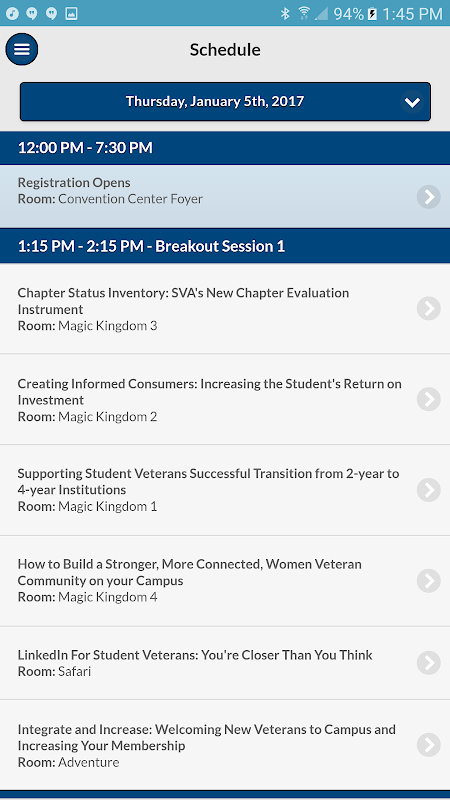 The official app for the 9th Annual SVA National Conference. Since 2008, NatCon has been the largest annual gathering of service members, veterans, advocates, thought-leaders, stakeholders, and supporters in higher education in the world. Student veterans, higher education professionals, alumni, and advocates will have the opportunity to learn from more than 1,500 of their peers at the beautiful Disneyland® Hotel and Resort.