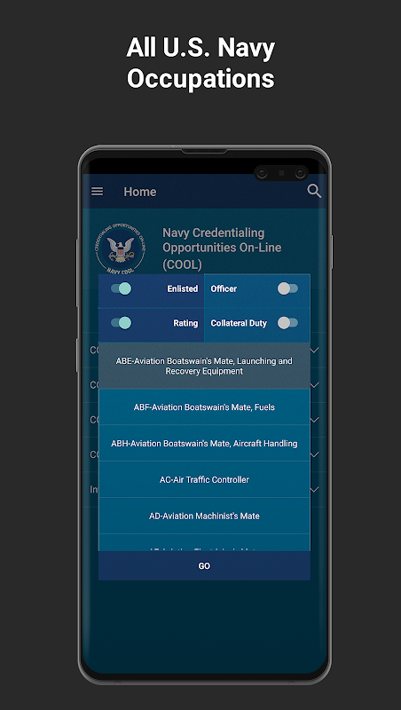 Beim Start der App wählen Benutzer eine Dienstgrad- oder Offiziersbezeichnung sowie Nebenpflichten aus. Sobald dies ausgewählt ist, filtert Navy COOL Inhalte, um nur Daten anzuzeigen, die für die Auswahl des Benutzers relevant sind.