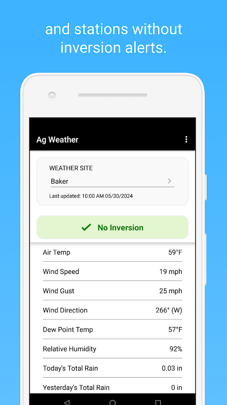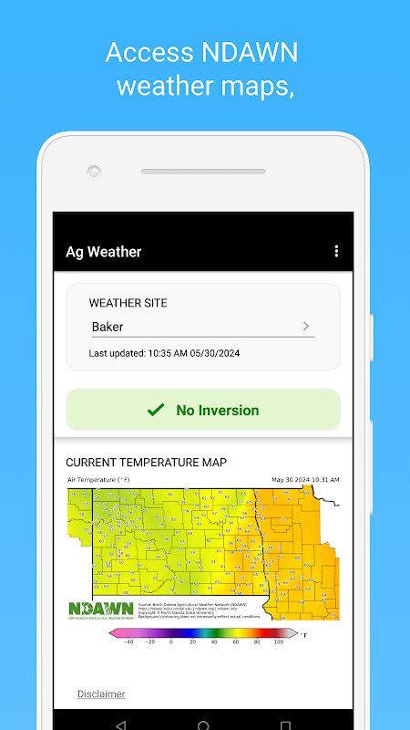 Echtzeit-Wetterdaten von dem North Dakota Agricultural Weather Network (NDAWN) verwendet werden, Low-Level-Lufttemperatur Inversionen zu erfassen. Ein Lufttemperaturumkehr tritt auf, wenn die Lufttemperatur in der Nähe des Bodens über die Luft kälter ist als. Der Kühler und daher dichte Luft kann Sprühpartikel machen Ziel abdriften, die oft als Abdrift verwiesen. Da Versprühen Inversion während einer Lufttemperatur unter Verletzung der Anweisungen auf dem Etikett ist, diese app, sobald eine Inversion detektiert wird, sendet eine Push-Benachrichtigung an den Benutzer zu informieren, daß sie Spritzen länger sinnvoll sein kann. Diese Inversion Warnungen werden erneut gesendet gelegentlich, bis die Inversion nicht mehr vorhanden ist für die Station ausgewählt. Neben Inversion Warnungen, Wetterdaten, einschließlich der Windgeschwindigkeit und Temperaturdaten, die auch kritische Informationen beim Sprühen zur Verfügung steht. Alle NDAWN Stationen die aktuellen Wetterbedingungen alle 5 Minuten aktualisiert.